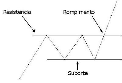 Quando os preços conseguem superar uma resistência dizemos que ocorreu um rompimento da mesma (veja ilustração acima). O rompimento ocorre porque a pressão compradora que gerou o movimento de alta dos preços continua mais forte que a pressão vendedora mesmo quando atinge a resistência - ou seja, o otimismo é grande e há muito mais agentes do mercado tentando comprar do que agentes desejando vender.